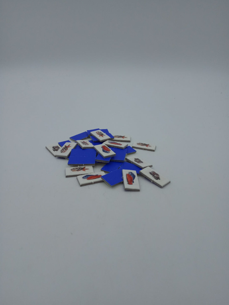 Counter aus Pappe, Frontseite Muscheln, Fische oder Austern mit Perlen, Rückseite blau = Mix