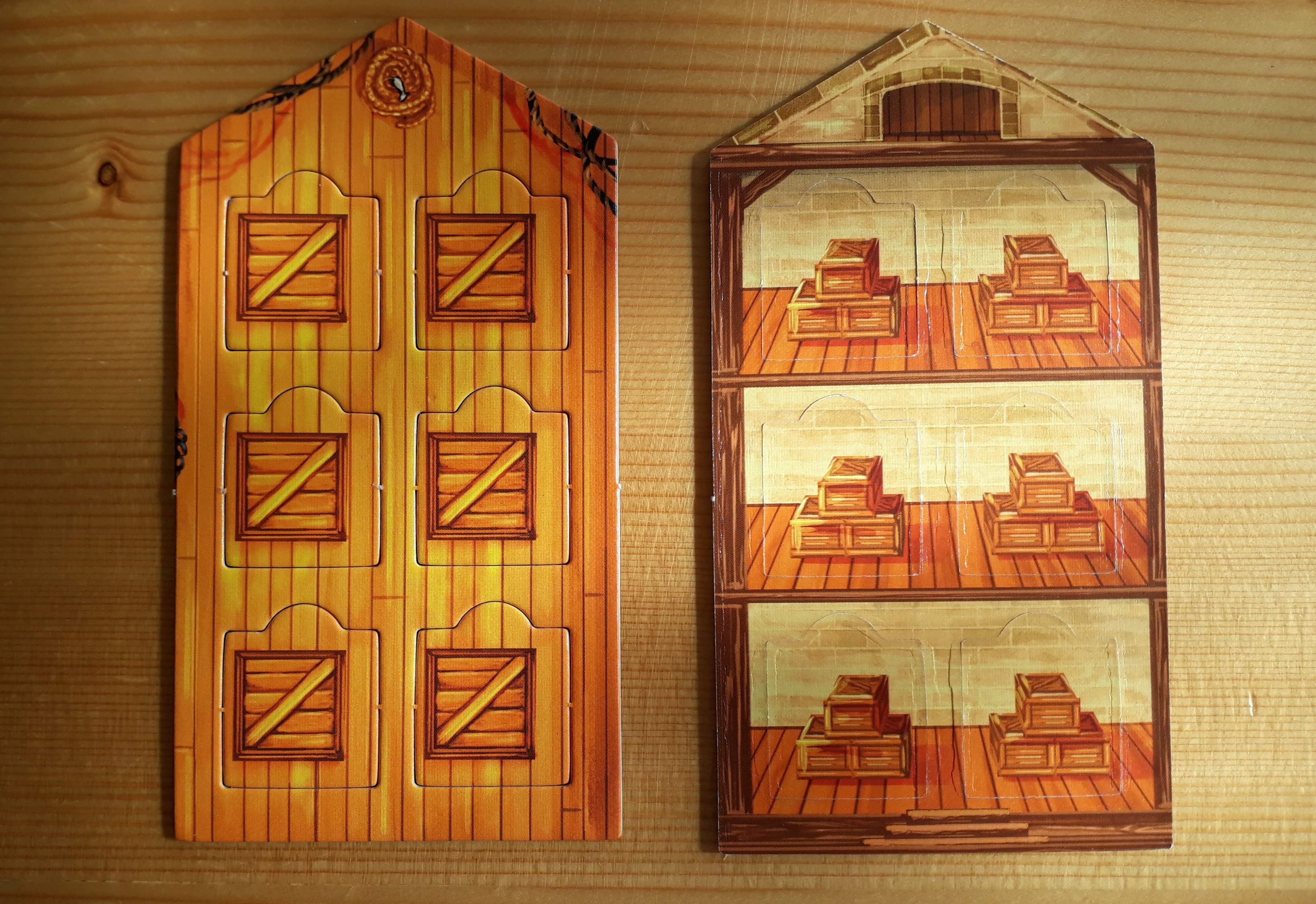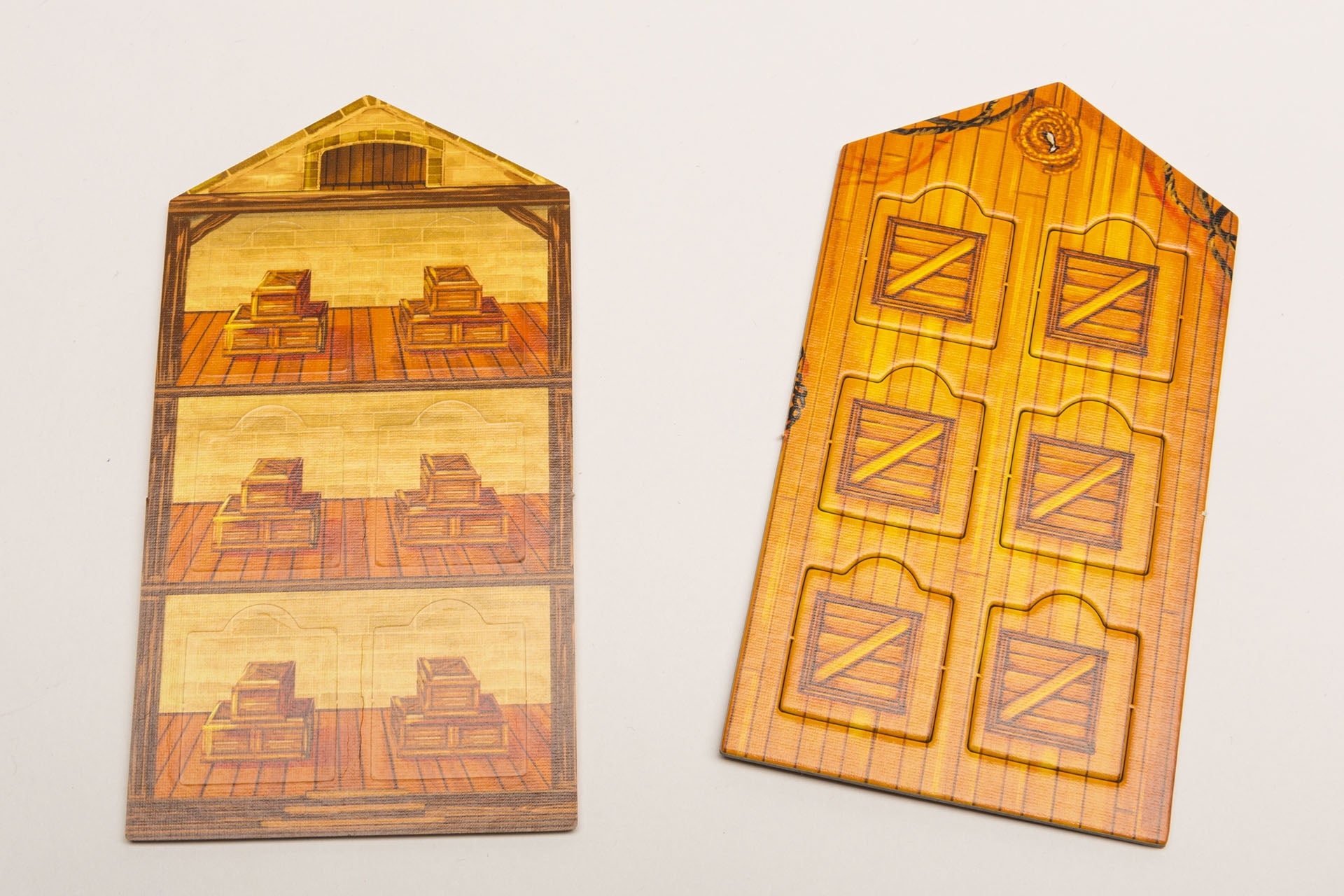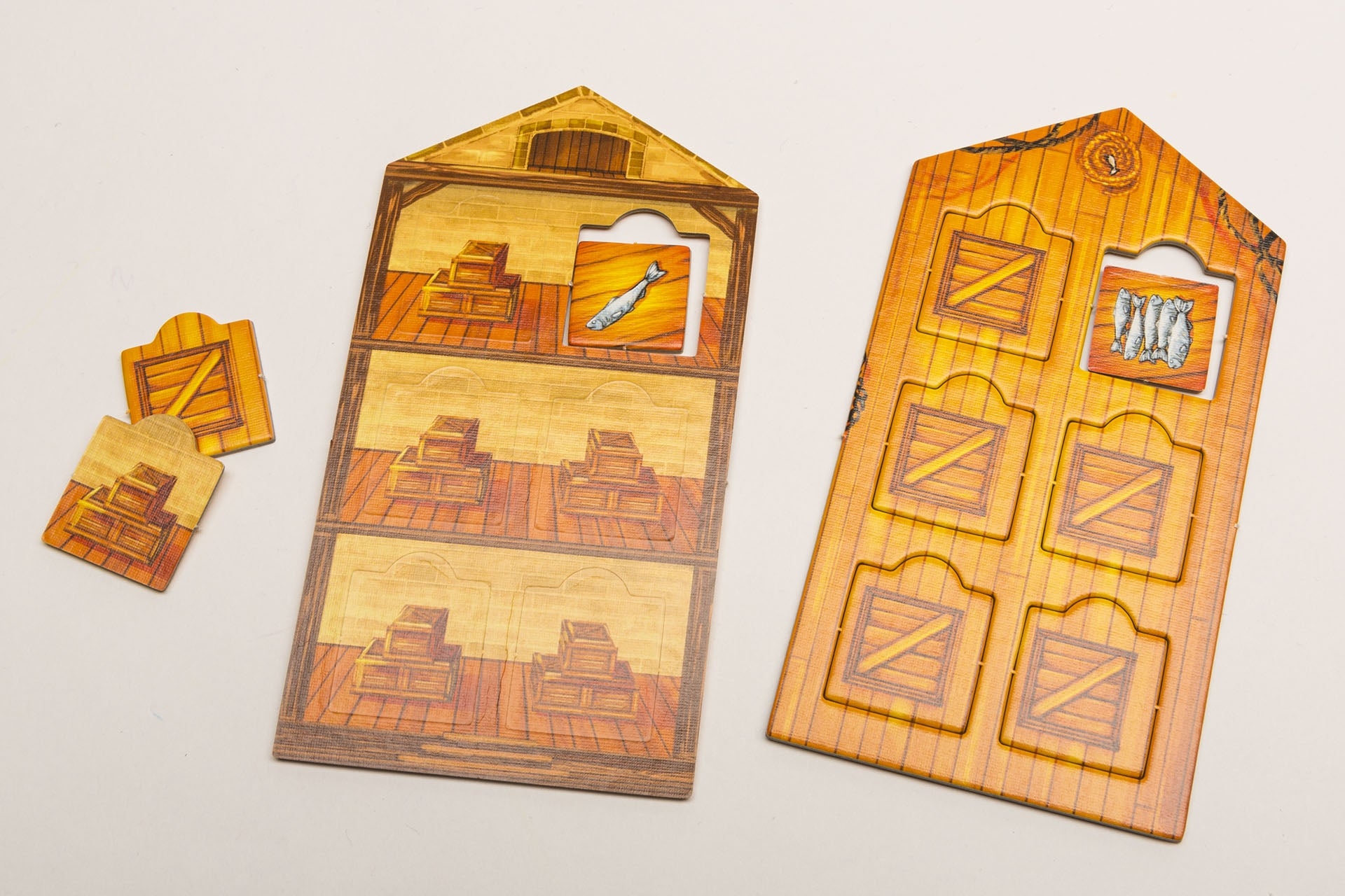 In die Aussparungen können Warenplättchen platziert werden. Mitgeliefert werden 6 passende Counter mit dem Motiv "Kiste" bzw. "Kisten"