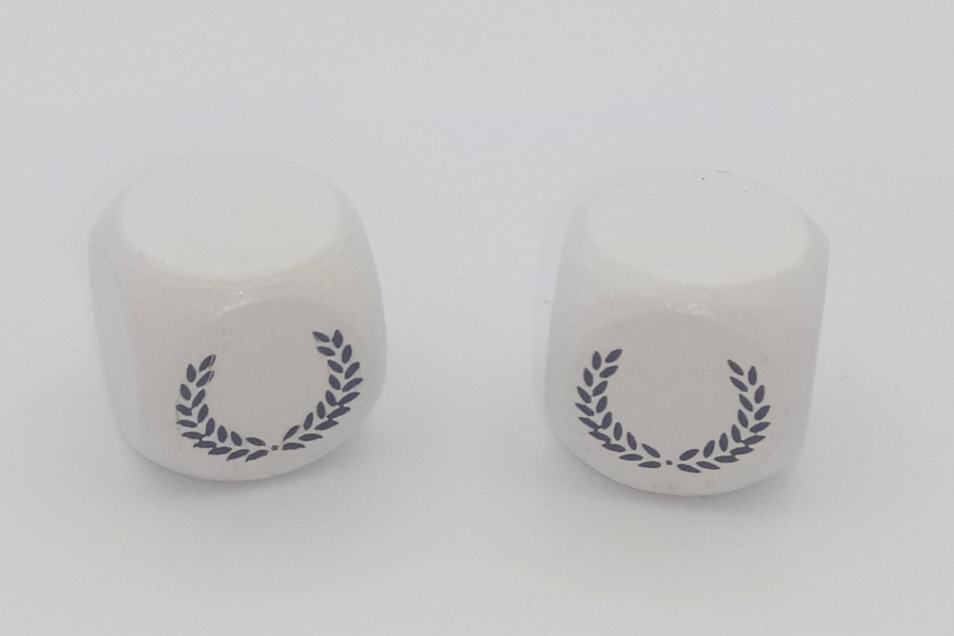 Wooden dice 15mm white with open spaces, laurel wreath in black on two opposite sides