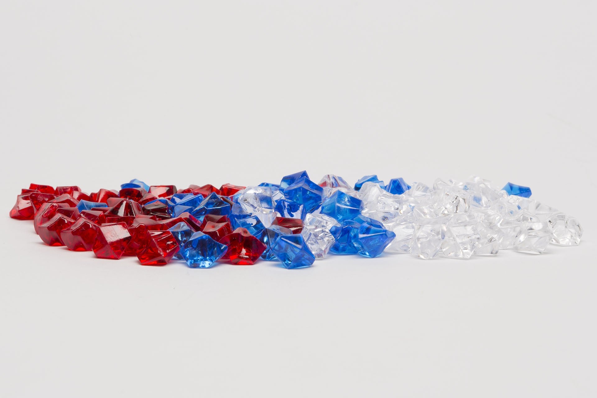 Crystal stones made of plastic in transparent white, red, blue, 125 pieces per set, approx. 10x10 mm diameter