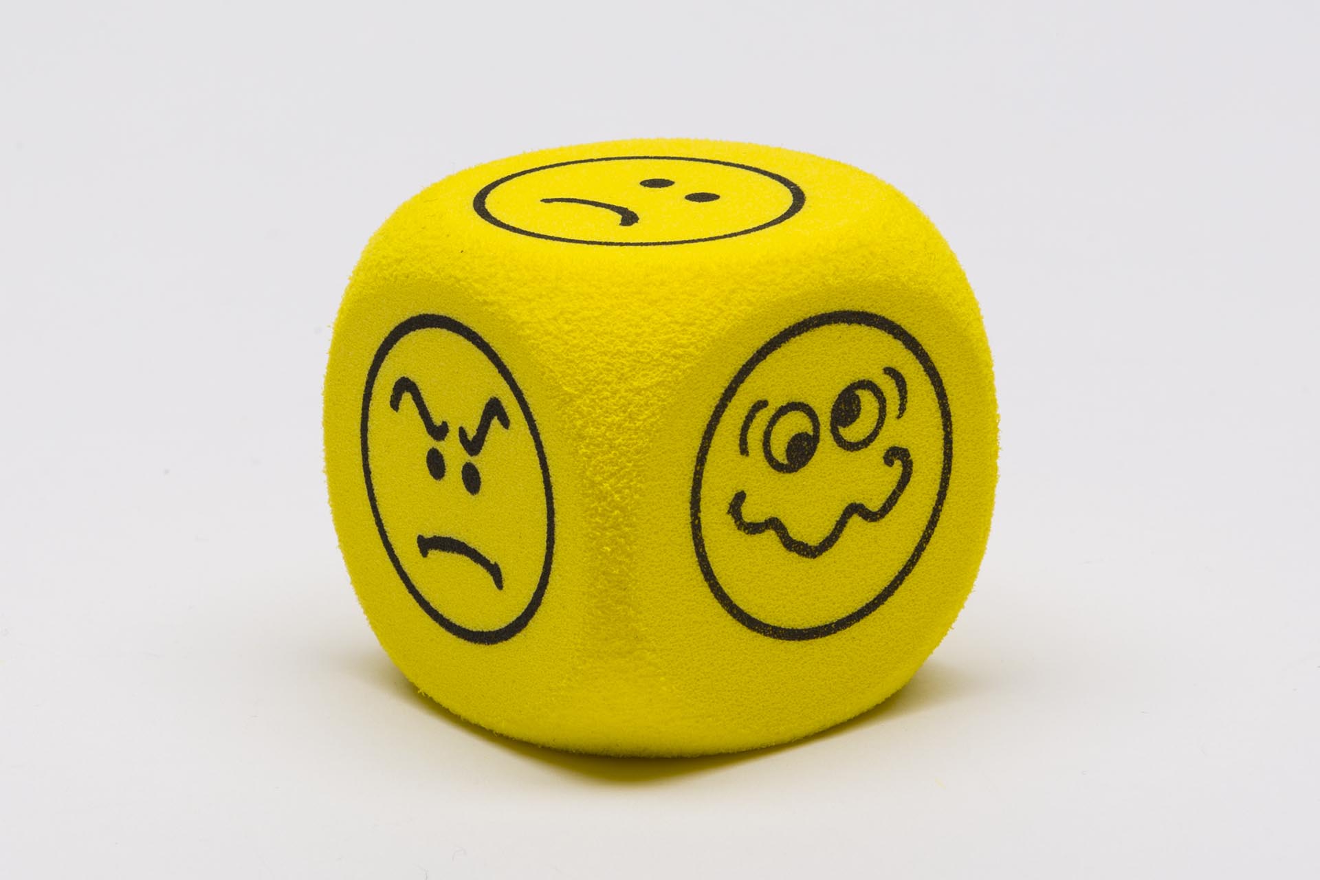 Foam dice with black faces, 40 x 40 mm, in yellow