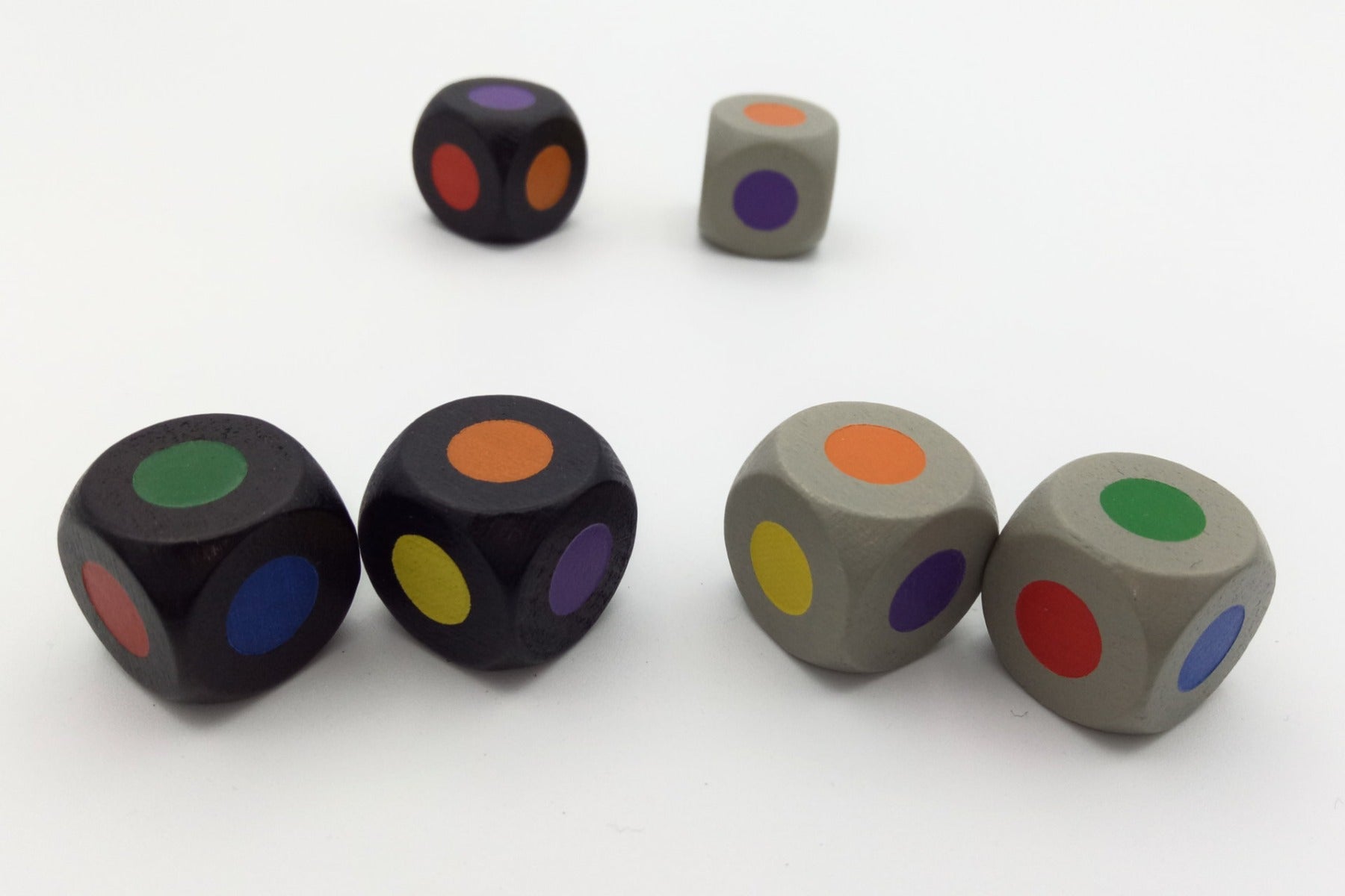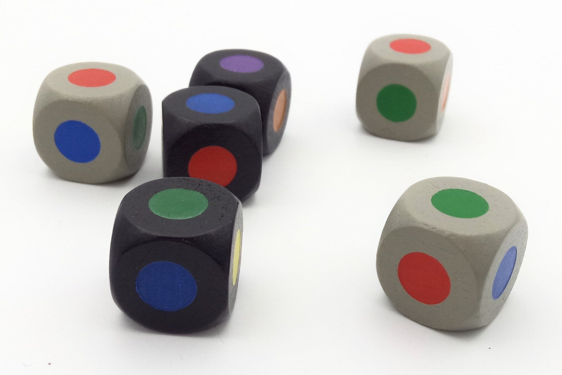 Standard wooden dice with colored dots; 16 mm, each with the colors red, yellow, green, blue, and orange,purple - theThe color to be chosen is the base color of the cube! (gray or black)
